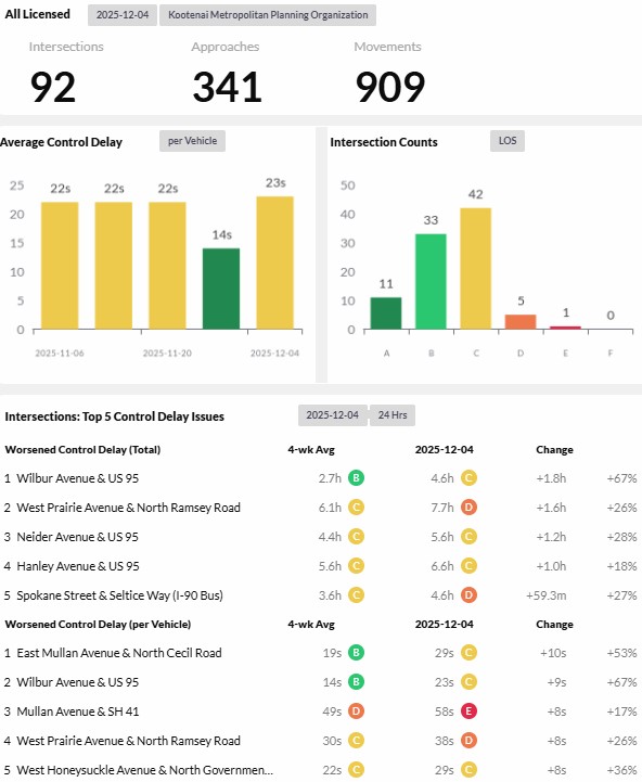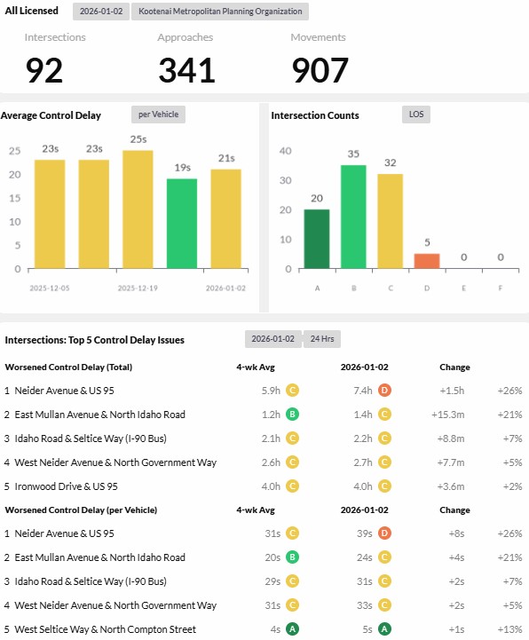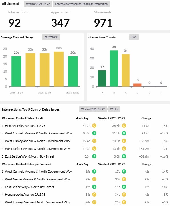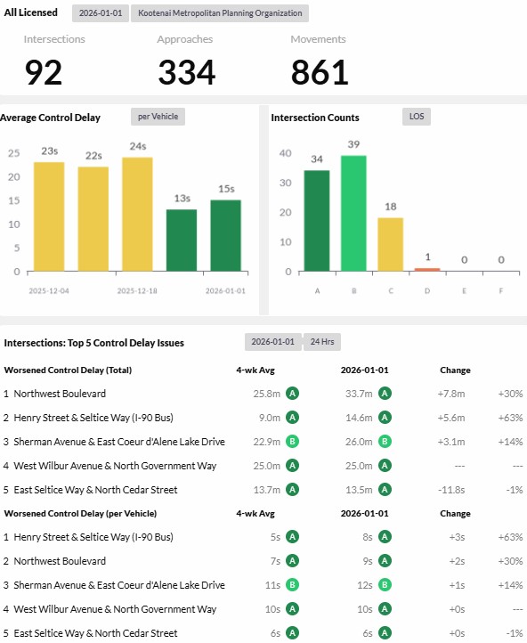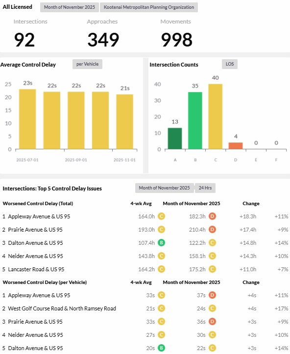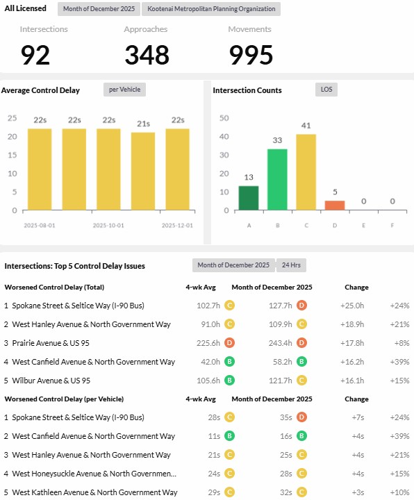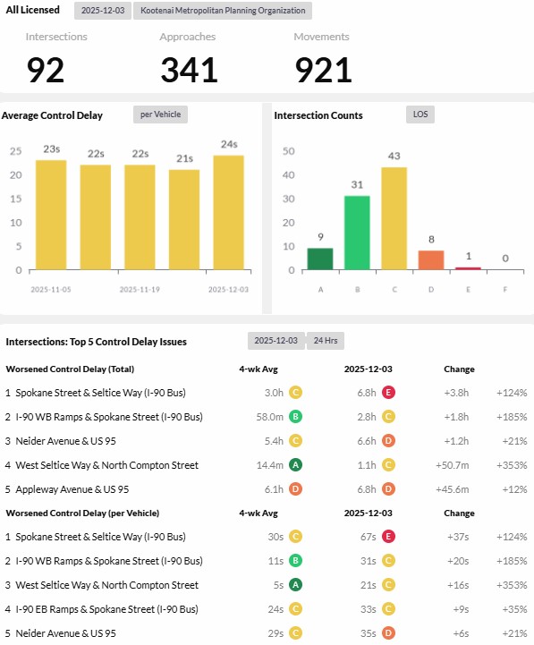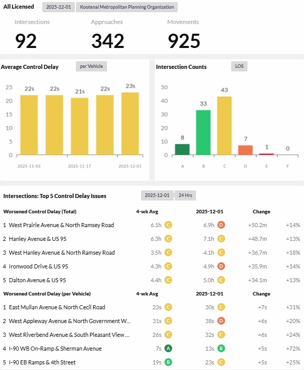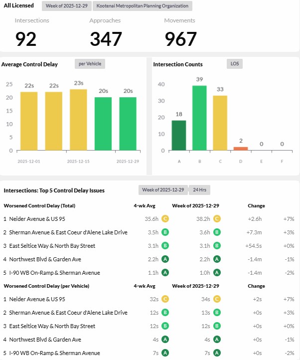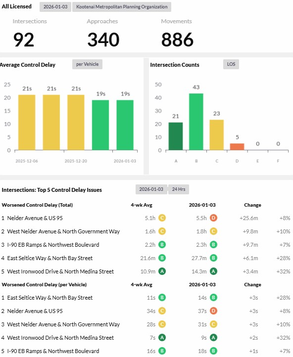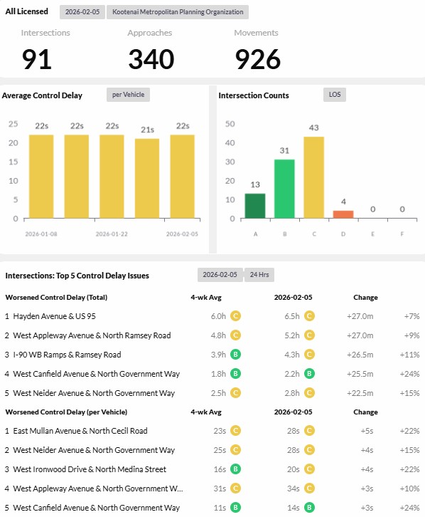 Reports are provided daily, weekly, and monthly and analyze 93 intersections and over 300 approaches for the given time period. The top five intersections with control delay issues by both worsened control delay by total time and worsened control delay per vehicle are reported. - Corridor Performance Reports