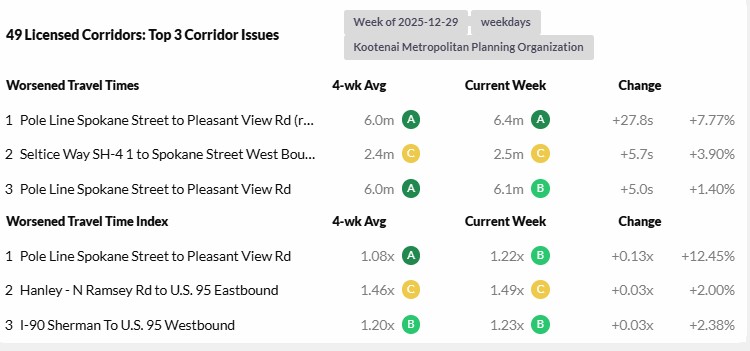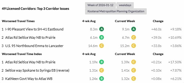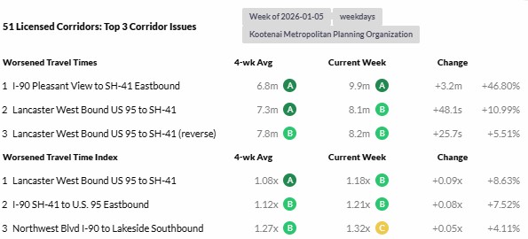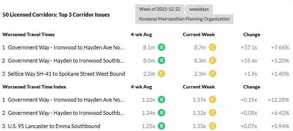 Reports are provided weekly for the period Monday through Sunday and analyze 23 corridors. The report highlights the top three corridor issues identifying corridor intersections with the worsened travel times and worsened travel time index.